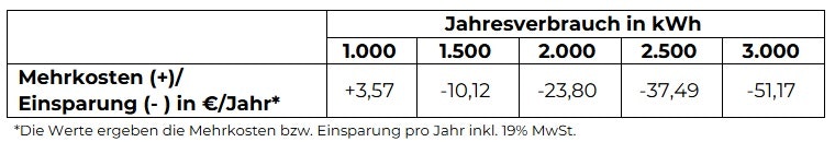 Die Mehrkosten oder Einsparungen durch die Preisanpassung hängen vom individuellen Verbrauch ab. Bei Haushalten mit niedrigem Jahresverbrauch kann die Erhöhung des Grundpreises die Senkung des Arbeitspreises übersteigen. Ab einem Jahresverbrauch von 1.130 kWh überwiegt die Entlastung, und die Gesamtkosten sinken.